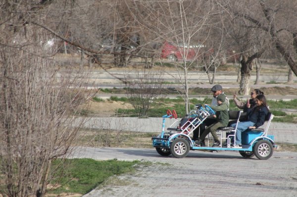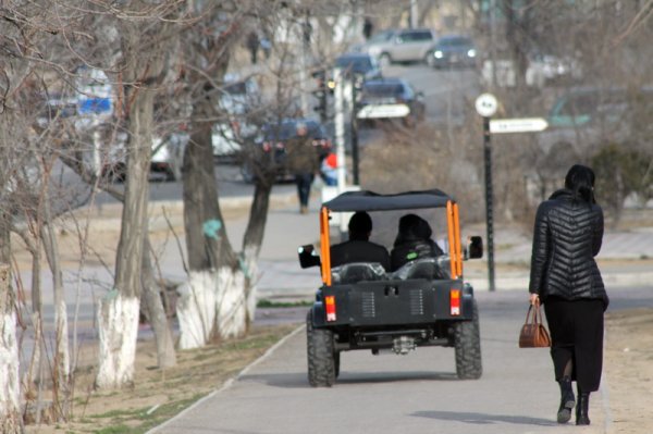 Мимо проносятся подростки на элетромобиле багги. С визгом они входят в повороты, устраивая беспредельную езду по парку и на участках между деревьями.