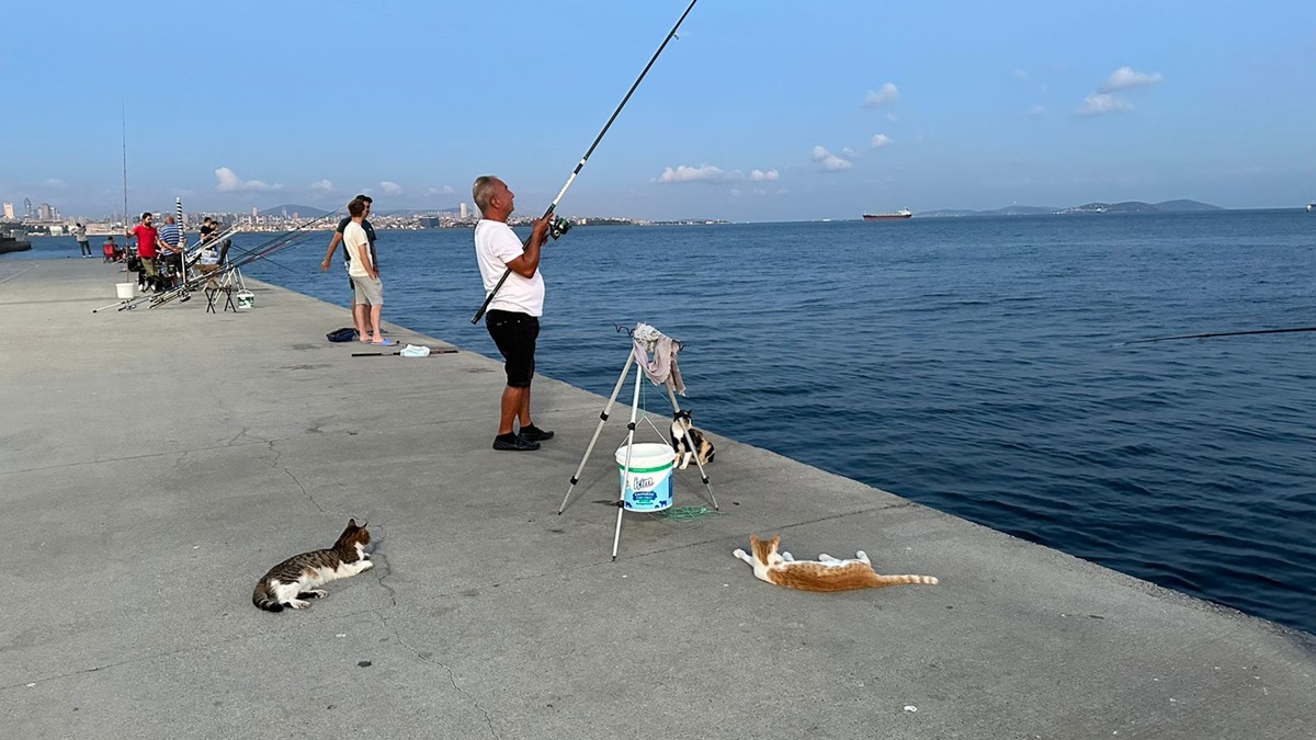 На набережной коты охраняют рыбаков, ведь им часто перепадает рыбка.