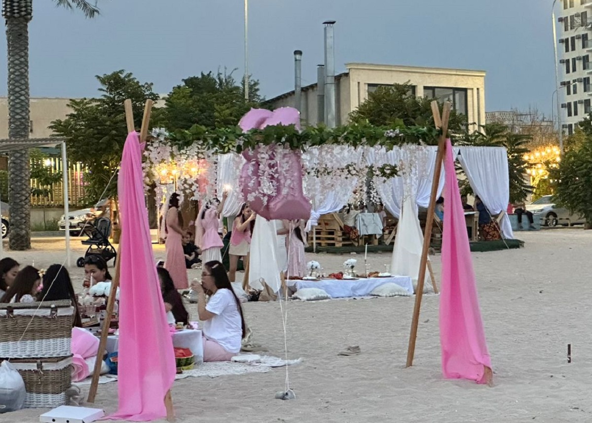 Пляж живёт полной и насыщенной жизнью: в море резвятся дети, взрослые отдыхают на расстеленных пледах, наслаждаясь морским бризом, а молодёжь придумывает тематические фотозоны, устраивает вечерние посиделки и ужины прямо под звёздным небом.