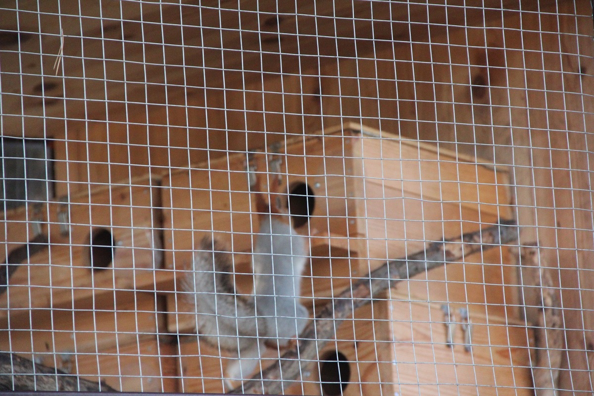 Просторный и уютный домик полностью приспособлен для комфортной жизни животных: внутри установлены два больших беговых колеса, кормушки, поилки и аккуратные двухкомнатные «бельчатники» для отдыха и сна.