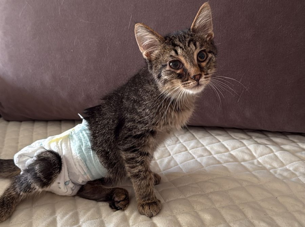 Ещё одна трагическая история произошла летом прошлого года на рынке «Алем». Маленький котёнок попал под колёса автомобиля «Газель». Очевидец происшествия позвонил волонтёрам и попросил срочно помочь животному. На место приехала волонтёр, которая незамедлительно доставила котёнка к ветеринару. По результатам обследования был поставлен диагноз - защемление нервов в области позвоночника. Животному проводили курс массажей и лечения, однако, к сожалению, задние лапки так и не восстановили подвижность.