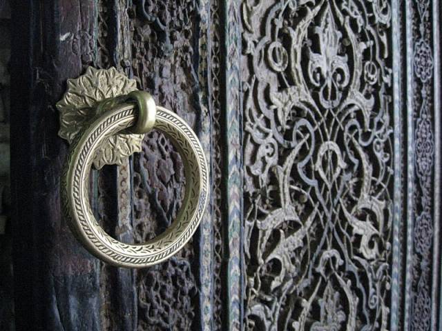 В старые времена существовало такое правило, если на входных воротах в дом одно кольцо поднято вверх, а другое опущено, значит мужчины ушли, в доме только женщины. Просьба не беспокоить и в дом не входить.