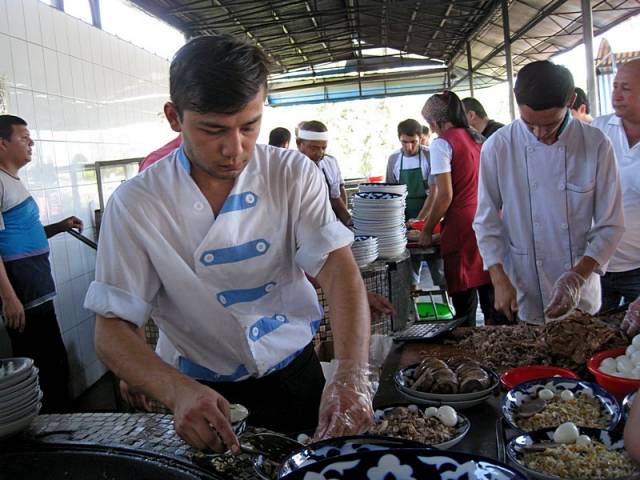 Возле телевышки находится центр плова. Во дворе установлены огромные казаны, в которых шеф-повара с подмастерьями готовят плов. Заказ принимают быстро, просят пройти в обеденный зал, где прохладно и много места. В Ташкенте время плова - с 10:00 до 14:00. Как сказали местные жители, после двух часов дня есть плов не принято. Мы его попробовали. На мой вкус он оказался так себе.