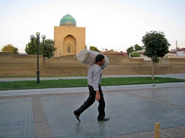 За купюру в 20 000 тенге мне вручили вот такую пачку местной валюты. Чтобы носить узбекские сумы, нужна либо большая сумка, либо приличный пакет.