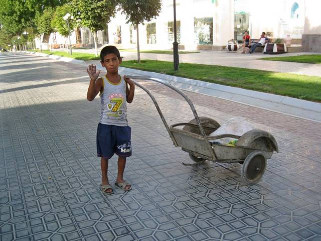 А у этого пацана свой бизнес. От глыбы льда скребком он откалывает кусочки замороженной воды в пиалы, поливает мёдом и продаёт порцию за тысячу сум. В жару торговля идёт очень бойко.