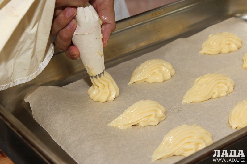 - Тесто заливаем в кондитерский мешок и придаем форму пирожному. В нашем случае это ракушка, - расказал Айбат Жалгасбаев. Выпекать 10 минут при температуре 210 градусов, после еще 10 минут при температуре 180 градусов.