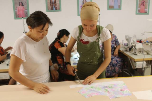 Самая молодая ученица, 21-летняя Жулдыз Нургалиева, инвалид III группы (глухонемая). Шьет нарядное платье