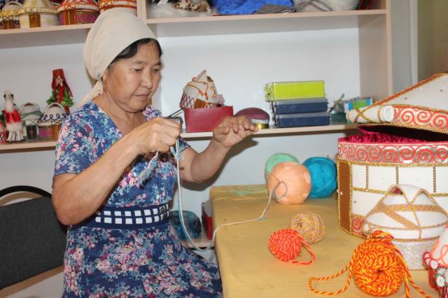 Жамал Нуршабаева, инвалид I группы (глаукома, катаракта), занимается оформлением пряжи