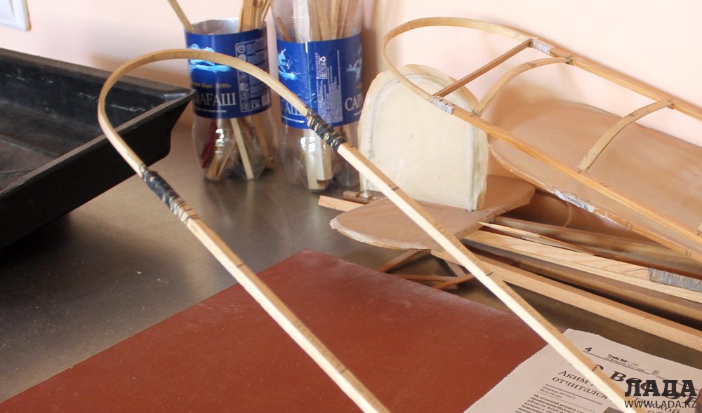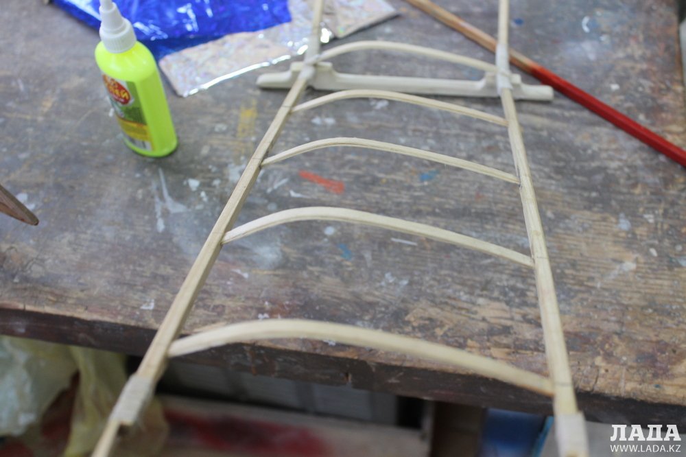 Далее делают закругления на крыльях — для этого рейки вымачивают в воде. Детали склеивают ПВА и обматывают основания ниткой.