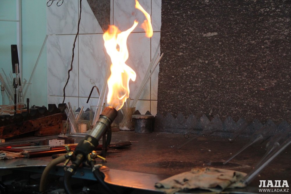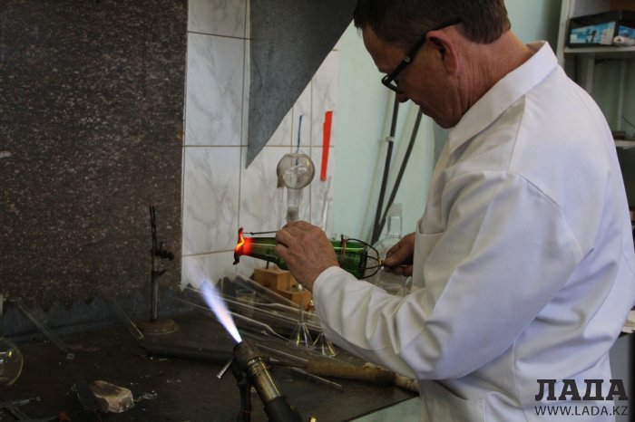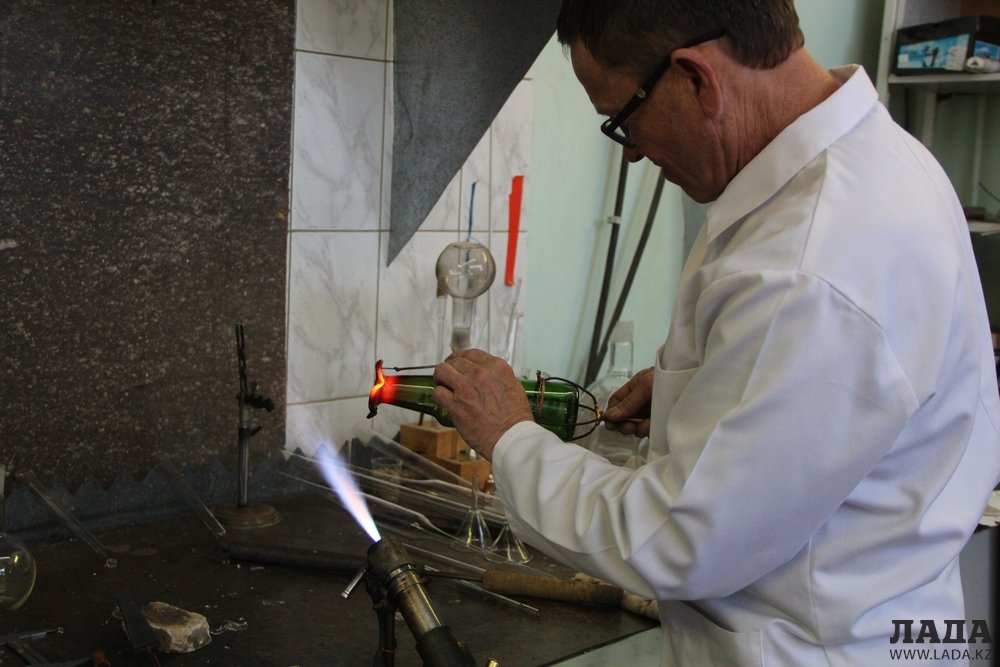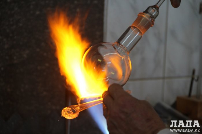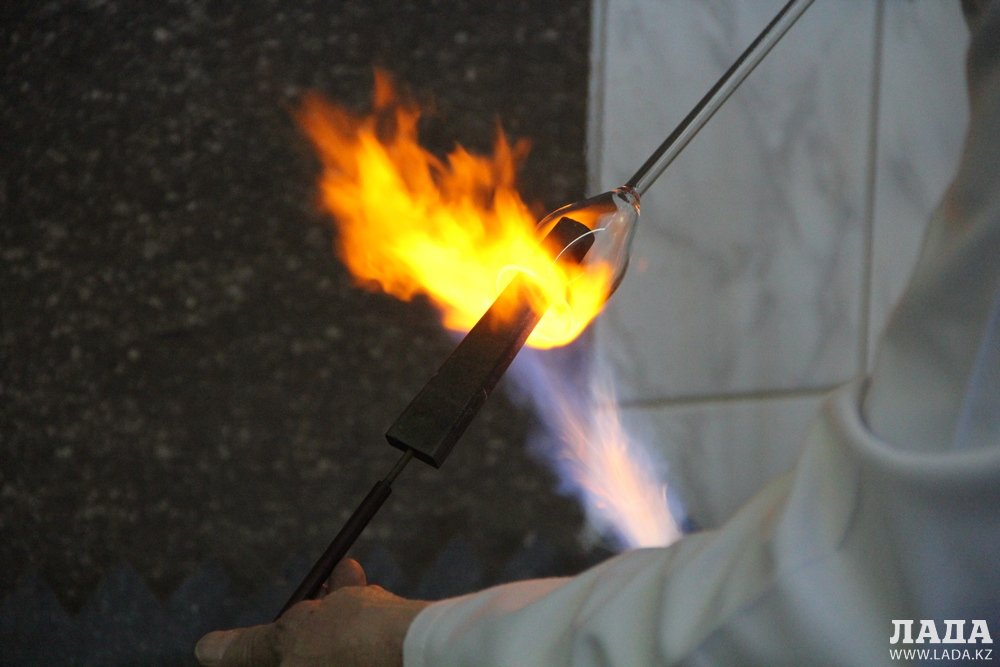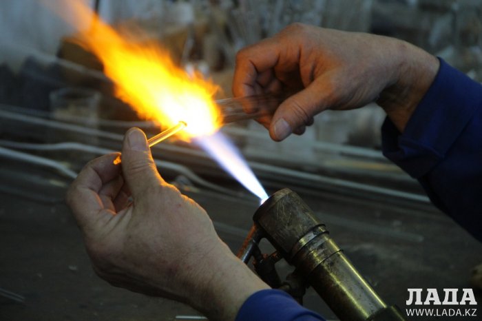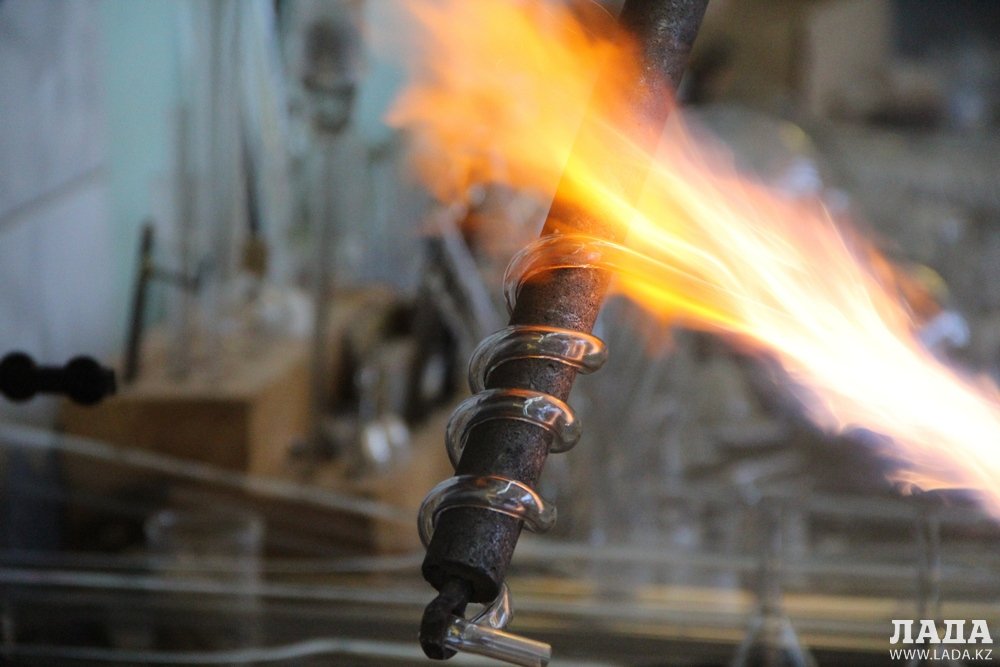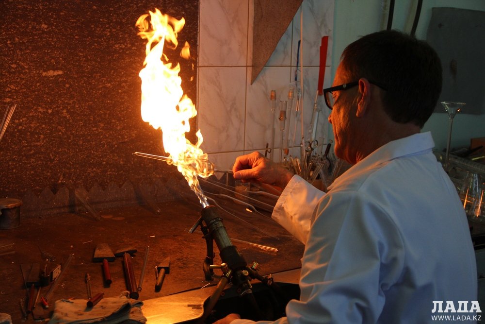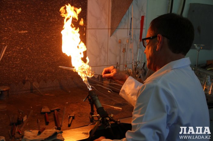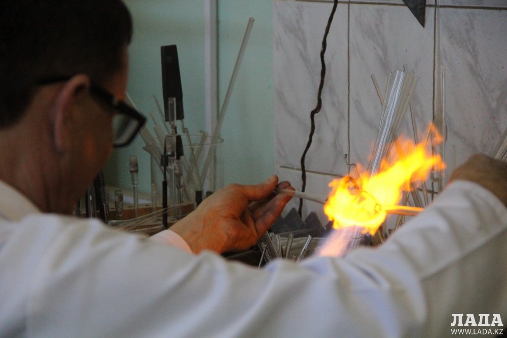 Владимир Иванов 36 лет работает стеклодувом по производству химической и лабораторной посуды и приборов в ТОО «МАЭК-Казатомпром». Небольшая стеклодувная мастерская расположена на территории ЦУВС-2.