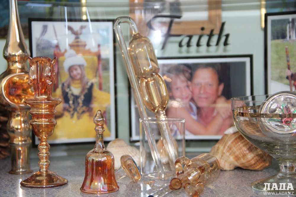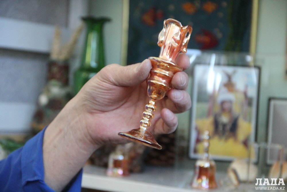 Помимо лабораторной посуды, на стеллаже в мастерской хранятся и сувениры, сделанные руками мастера: колокольчики, подсвечники и елочные игрушки, которые он изготовил еще 17 лет назад. Сегодня такие не купишь ни в одном магазине.