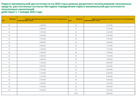 Единый накопительный пенсионный фонд (ЕНПФ) опубликовал пороги достаточности для использования пенсионных накоплений на 2023 год, передает Tengrinews.kz.