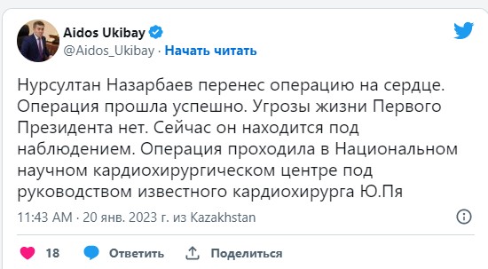 "Нурсултан Назарбаев перенес операцию на сердце. Операция прошла успешно. Угрозы жизни Первого Президента нет. Сейчас он находится под наблюдением", - сообщил Айдос Укибай в Twitter.