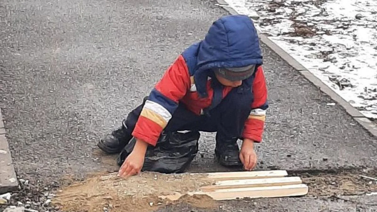 - мальчик, скорее всего, заделал неудобную яму для своей мамы с коляской, которая каждый день ходит по этому тротуару;