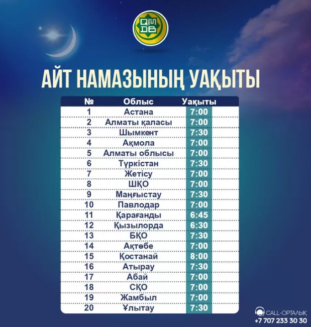 Духовное управление мусульман Казахстана опубликовало время праздничной молитвы (намаза) на Ораза айт в городах страны, передает ИА «NewTimes.kz».