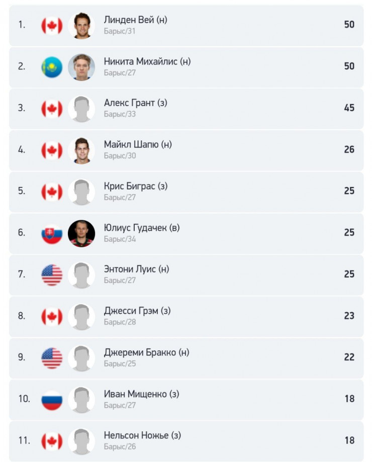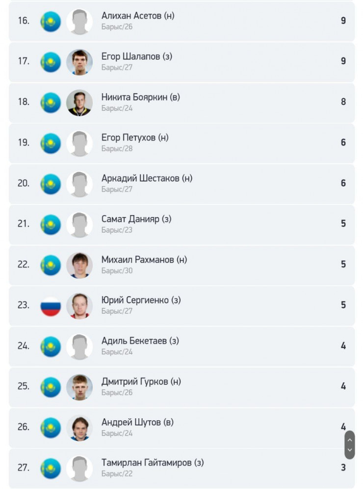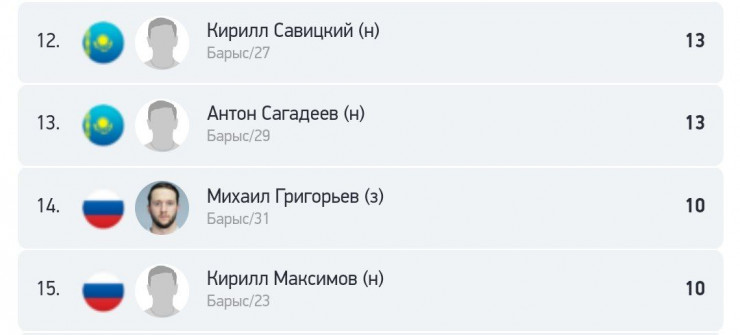 Нападающий сборной Казахстана Кирилл Савицкий идет на 12-й позиции, а за ним - три хоккеиста с российскими паспортами (Сагадеев отказался от документов Казахстана).