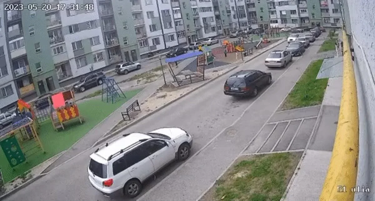 Судя по кадрам, водитель сначала сбил ребенка, который перебегал дорогу, а затем наехал на детскую площадку. К счастью, в этот момент там не было других детей.