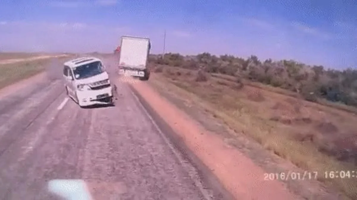Крупное дорожно-транспортное происшествие произошло в Акмолинской области. На трассе Костанай - Ауеликоль - Сурган минивэн столкнулся с большегрузами, на месте скончались 46-летний водитель и его сын. Момент аварии зафиксировала камера видеорегистратора, передает корреспондент Tengrinews.kz.