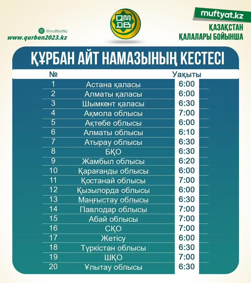 Духовное управление мусульман Казахстана опубликовало график чтения Курбан айт-намаза во всех регионах, передает ИА «NewTimes.kz».