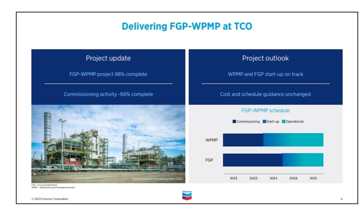 - Біздің қолымыздағы пайдаланылмаған қор жобаны ағымдағы бюджет аясында аяқтауға мүмкіндік береді, - деп атап өтті. Шеврон басшысы. Аталған жобалар толық іске қосылған соң ТШО тәулігіне 1 миллион баррель мұнай өндіріп, 2025 жылдан бастап 10 миллиард доллар ақша айналымын жасайды деп болжануда (мұнай баррелі 60 доллар болса).