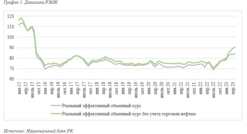 По словам начальника Управления аналитики BCC Invest Султана Жумагали, реальный эффективный обменный курс сейчас находится на максимальных значениях с 2015 года, когда был введен режим свободно плавающего обменного курса.