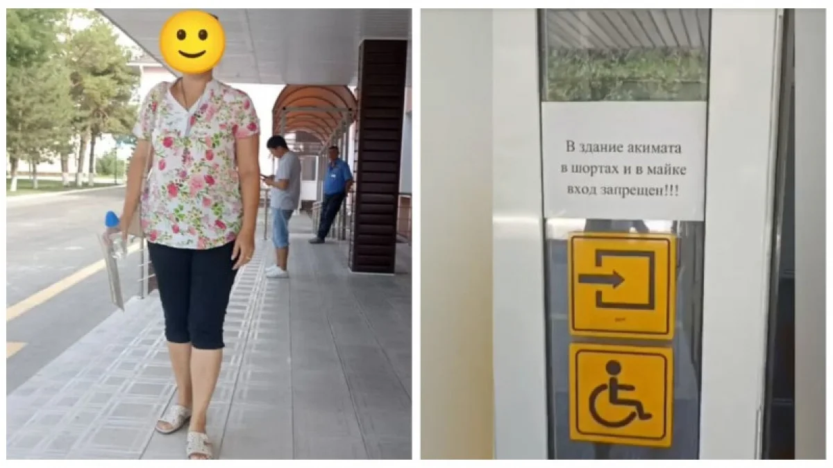 Судя по публикации, женщина пришла в госучреждение в рубашке и бриджах. Однако охранник отказался впустить посетителницу. На кадрах видно, что на двери висит объявление без печати и подписи: "В здание акимата в шортах и в майке вход запрещен!!!"