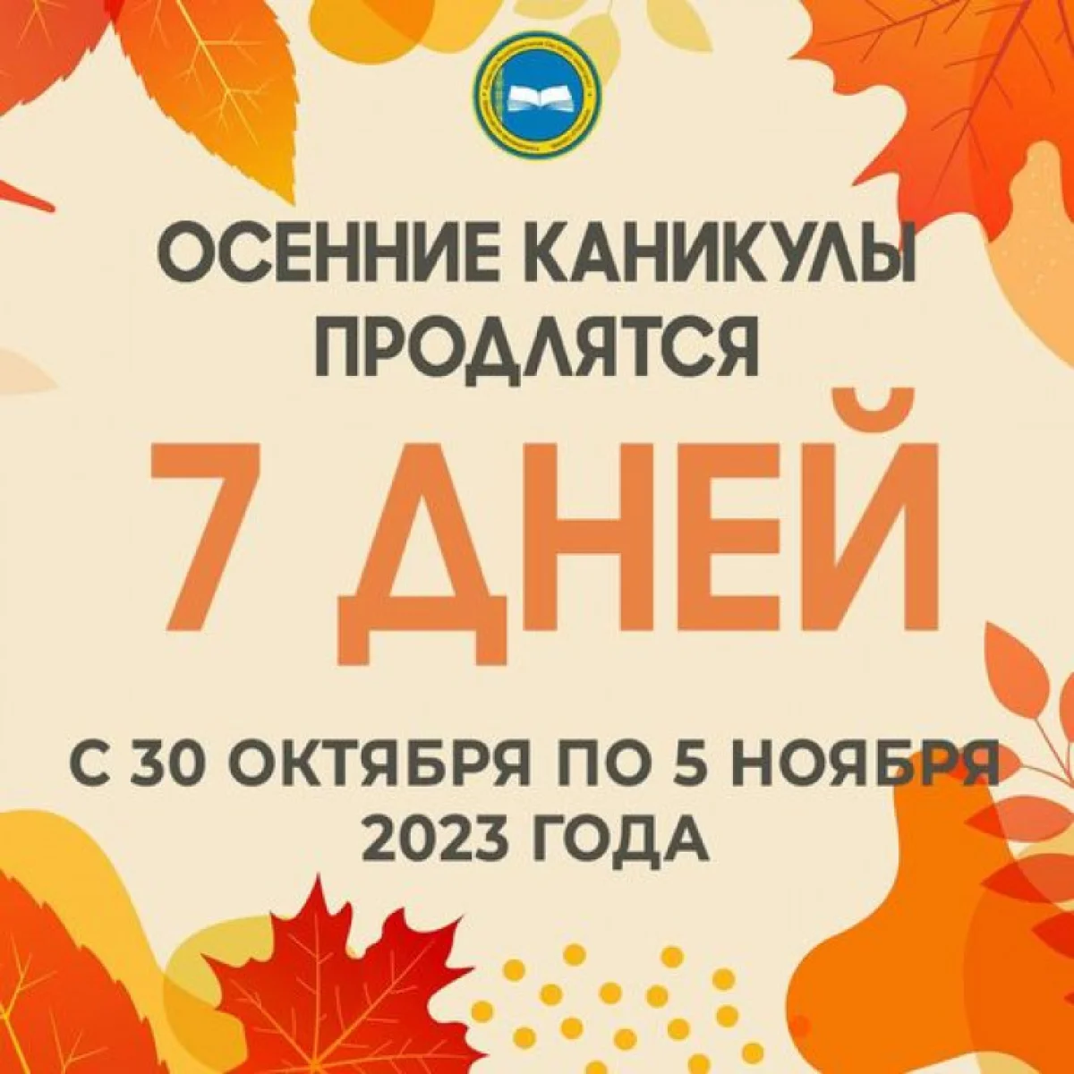 "В казахстанских школах завершается первая четверть. Осенние каникулы продлятся семь дней – с 30 октября по 5 ноября 2023 года включительно", - говорится в сообщении.