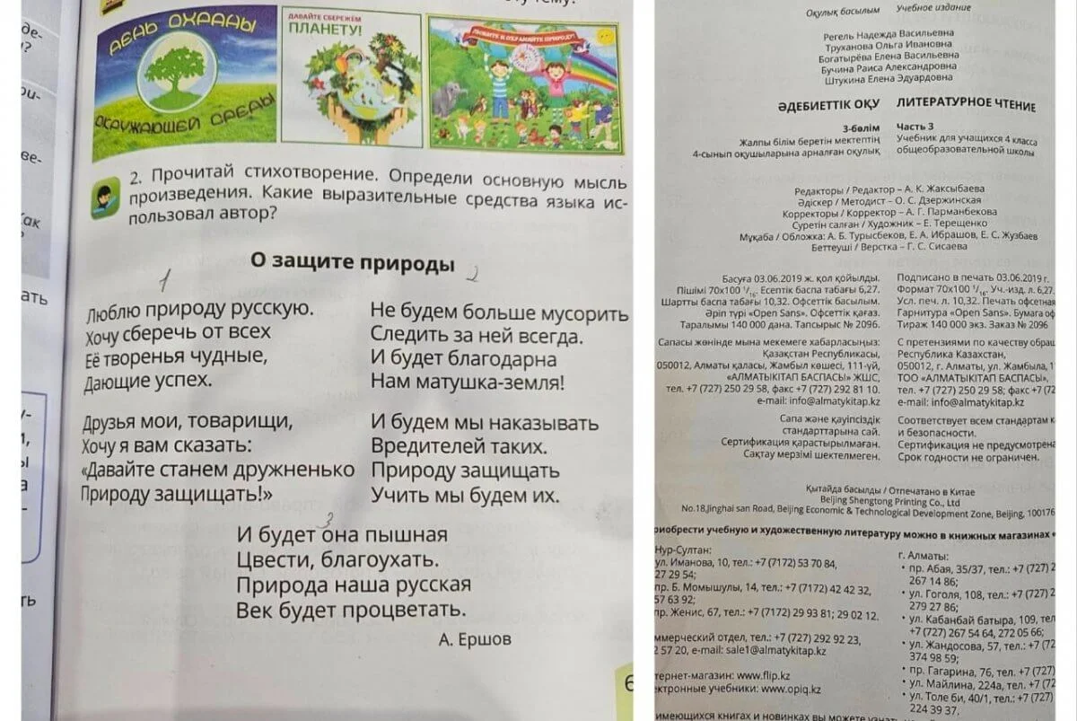 - Очередная партия бездарных стишков в учебнике литературы четвертого класса. Где были глаза составителей? Тут весь набор: от стилистических и грамматических ошибок до совковых понятий. Наказать вредителей, учить любить природу, беречь ее ото всех... Береги природу, мать твою! И вообще, почему в казахстанском учебнике заставляют любить природу русскую? У нас своей нет? – пишет автор поста.