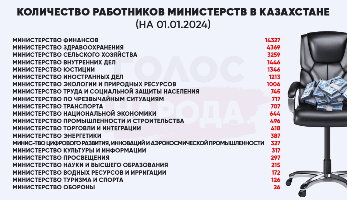 По данным бюро национальной статистики, население Казахстана составляет 20 033 546 человек (на 1 января 2024 года). Пользуясь несложными формулами, можно вычислить, что каждый 615-ый казахстанец является работником министерства, а каждый 1400-ый является работником минфина.