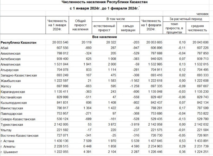 Бюро Национальной статистики Казахстана опубликовало информацию о численности населения страны с 1 января до 1 февраля, передает корреспондент Tengrinews.kz.