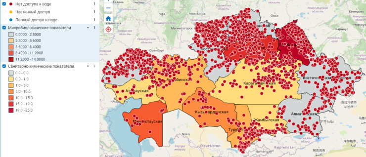 В 2020 году проведенное Ассоциацией практикующих экологов исследование показало, что свыше двух тысяч населенных пунктов в Казахстане лишены доступа к системам централизованного водоснабжения. На карте это выглядит так: