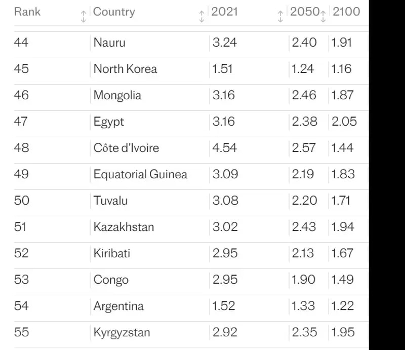 Только 6 из 204 стран - (Самоа, Сомали, Тонга, Нигер, Чад и Таджикистан) будут иметь уровень рождаемости выше уровня воспроизводства к 2100 году, и только только 26 стран будут по-прежнему иметь положительные темпы естественного прироста, где число рождений превысит число смертей. Если Казахстан сохранит такие же темпы рождаемости, он окажется в числе этих стран.