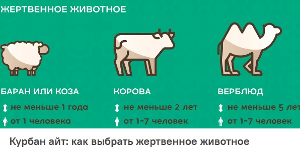 Важен и возраст жертвы: овца должна быть старше полугода, коза – старше года, корова (бык) – от двух лет; верблюд – старше пяти лет. Для заклания выбирают только здоровую скотину: если зверь слаб, хромает или имеет видимые изъяны, его мясо нельзя употреблять в пищу.