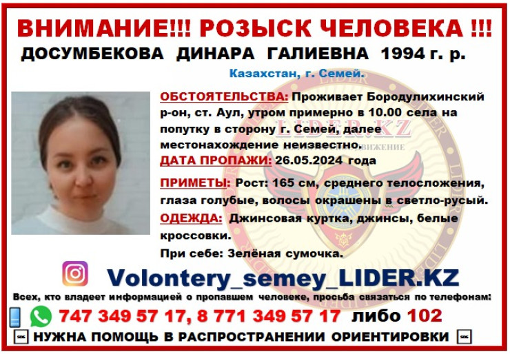 В области Абай ведутся поиски девушки. 2 июня в полицию обратилась жительница Бородулихинского района области Абай. Она сообщила о пропаже своей дочери Досумбековой Динары Галиевны 1994 года рождения.