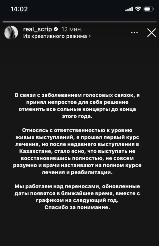 В связи с заболеванием голосовых связок я принял непростое для себя решение отменить все сольные концерты до конца этого года. Относясь с ответственностью к уровню живых выступлений, я прошел первый курс лечения, но после недавнего выступления в Казахстане стало ясно, что выступать, не восстановившись полностью, не совсем разумно, и врачи настаивают на полном курсе лечения и реабилитации.