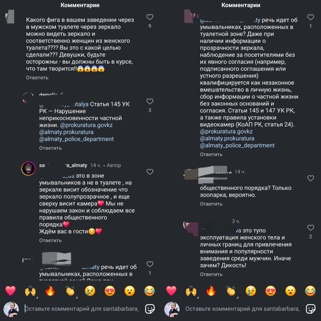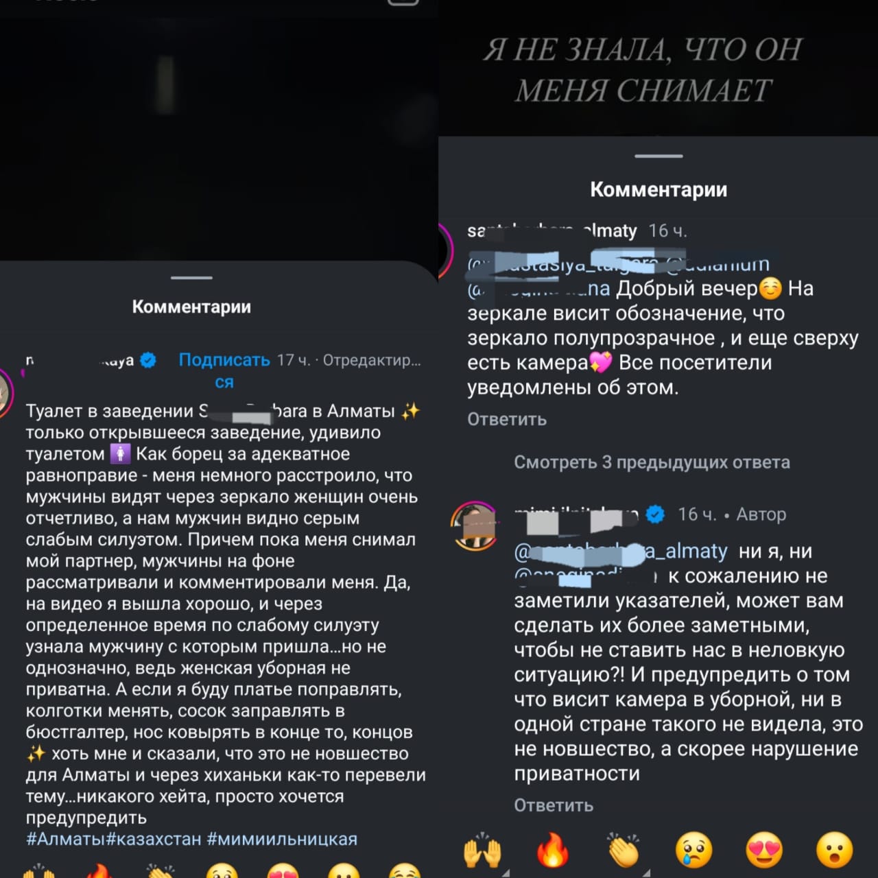 “Только открывшееся заведение удивило туалетом. Как борец за адекватное равноправие, меня немного расстроило, что мужчины видят через зеркало женщин очень отчетливо, а нам мужчин видно серым слабым силуэтом. Причем пока меня снимал мой партнер, мужчины на фоне рассматривали и комментировали меня. Да, на видео я вышла хорошо, и через определенное время, по слабому силуэту узнала мужчину, с которым пришла… А если я буду платье поправлять, колготки менять, сосок заправлять в бюстгальтер… Хоть мне и сказали, что это не новшество для Алматы… никакого хейта, просто хочется предупредить”, – пишет девушка.