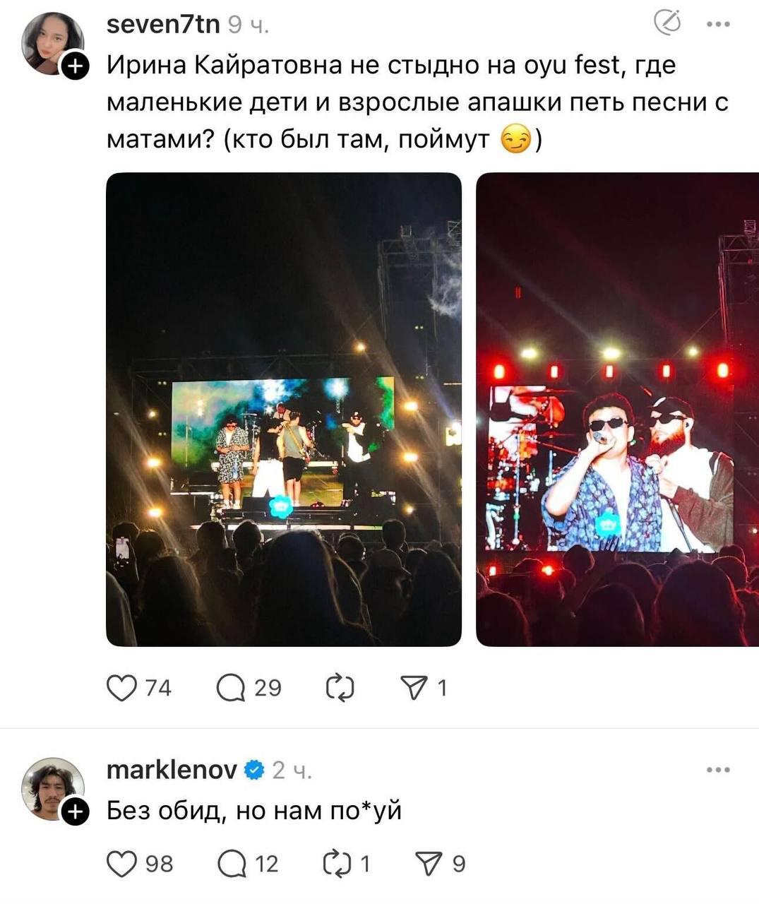Одна из зрительниц, побывавших на концерте, опубликовала пост в Threads, в котором выразила возмущение: «Ирина Кайратовна, не стыдно на OYU Fest, где маленькие дети и взрослые апашки, петь песни с матами? (кто был там, поймут)», - написала девушка под ником seven7tn.