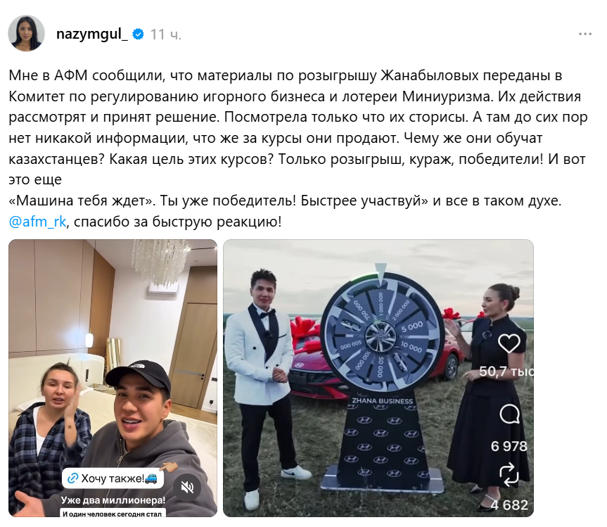 Журналист Назымгуль Кумыспаева открыто обратилась в Агентство по финансовому мониторингу (АФМ), попросив проверить законность подобных схем. Она поинтересовалась, можно ли в Казахстане проводить розыгрыши для продвижения платных курсов и платят ли организаторы налоги с полученных средств.