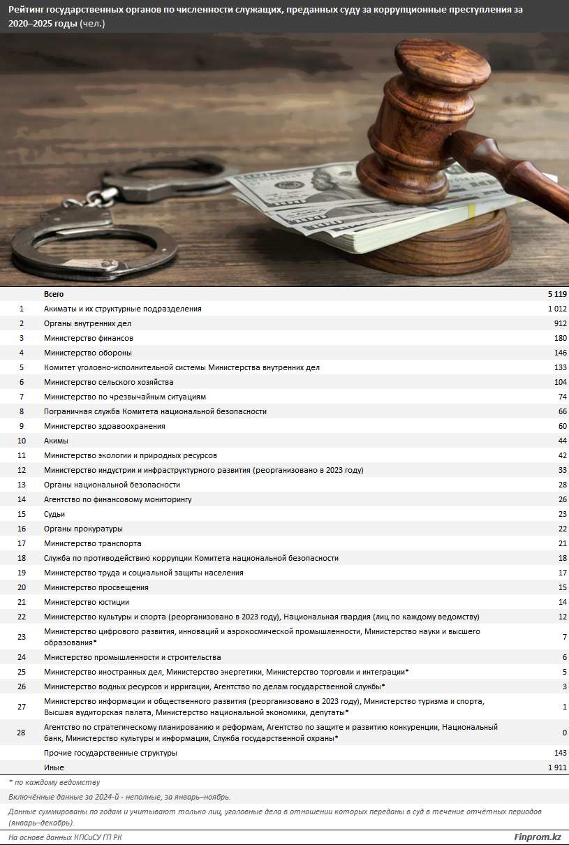 Статистика показывает, что коррупционные риски сохраняются в большинстве государственных структур Казахстана, при этом наибольшая концентрация дел приходится на акиматы и силовые ведомства.