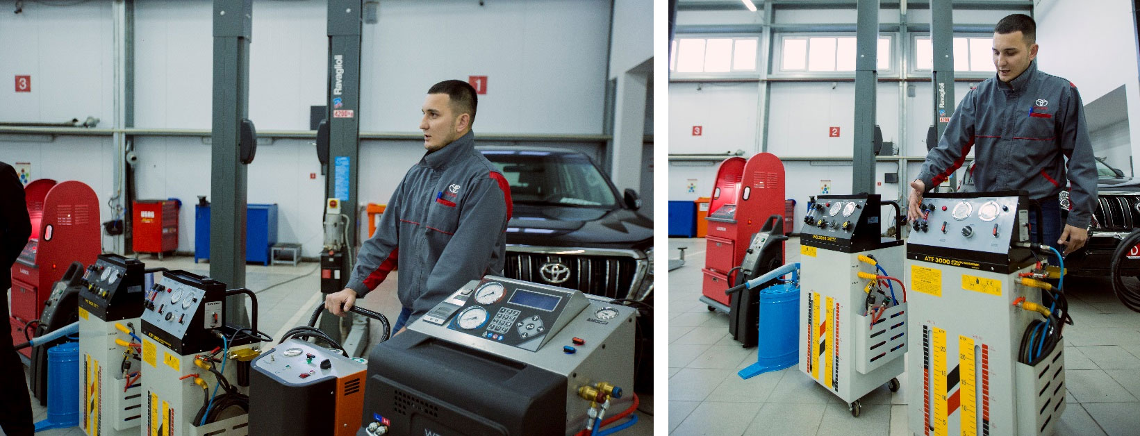 Кроме продажи автомобилей дилерский центр в Актау предоставляет сервисное обслуживание автомобилей всех марок. Сервисный центр включает в себя 10 постов слесарного ремонта, современный 3D стенд геометрии колес, пост шиномонтажных работ, пост электрика. В сервис зоне ремонта автомобилей механиками применяются новейшие аппараты: для регулировки фар; для заправки кондиционеров; для замены охлаждающей жидкости; для замены жидкости в АКПП; для чистки форсунок; для замены тормозной жидкости; аппарат для проточки тормозных дисков (без снятия тормозного диска со ступицы), профессиональный диагностический сканер «TOYOTA». Наличие современного оборудования позволяет проводить на самом высоком уровне диагностические и ремонтные работы любой сложности.