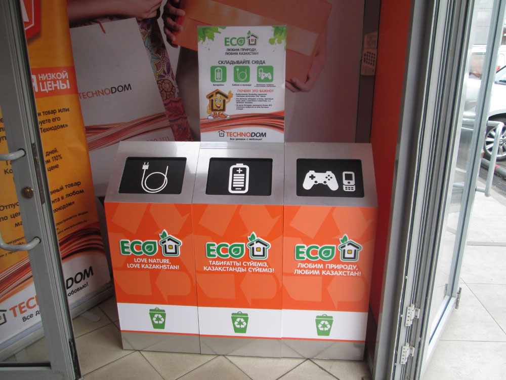 В компании считают: избавляться от подобного мусора обычным путем не стоит. Но что с ним делать? «Технодом» нашел решение этой проблемы. В рамках экологического проекта «Любим природу, любим Казахстан» во всех торговых залах компании устанавливают эко-боксы. Эти контейнеры являются гарантией правильной утилизации электронной техники и батареек. За 2016 год установлены 126 специальных контейнеров для раздельного сбора электронно-бытового мусора.