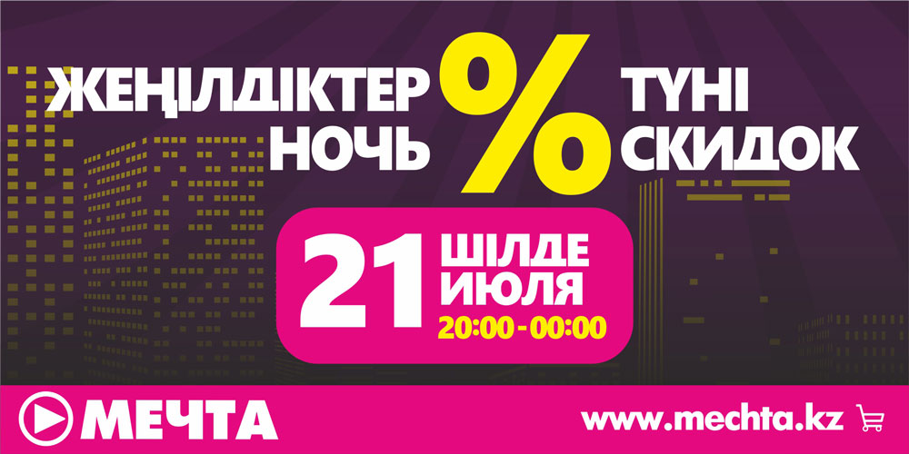 В пятницу, 21 июля, в сети магазинов электроники и бытовой техники «Мечта» пройдет акция «Ночь скидок». В эту ночь у вас будет уникальная возможность совершить покупки со скидками. Всех посетителей ждут реальные скидки на весь товар. Ждем вас в наших магазинах в городах Актау и Жанаозен!