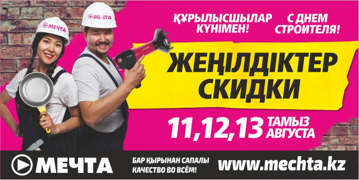 Сеть магазинов бытовой техники и электроники поздравляет казахстанцев с Днем строителя и объявляет о праздничных скидках 11, 12 и 13 августа!