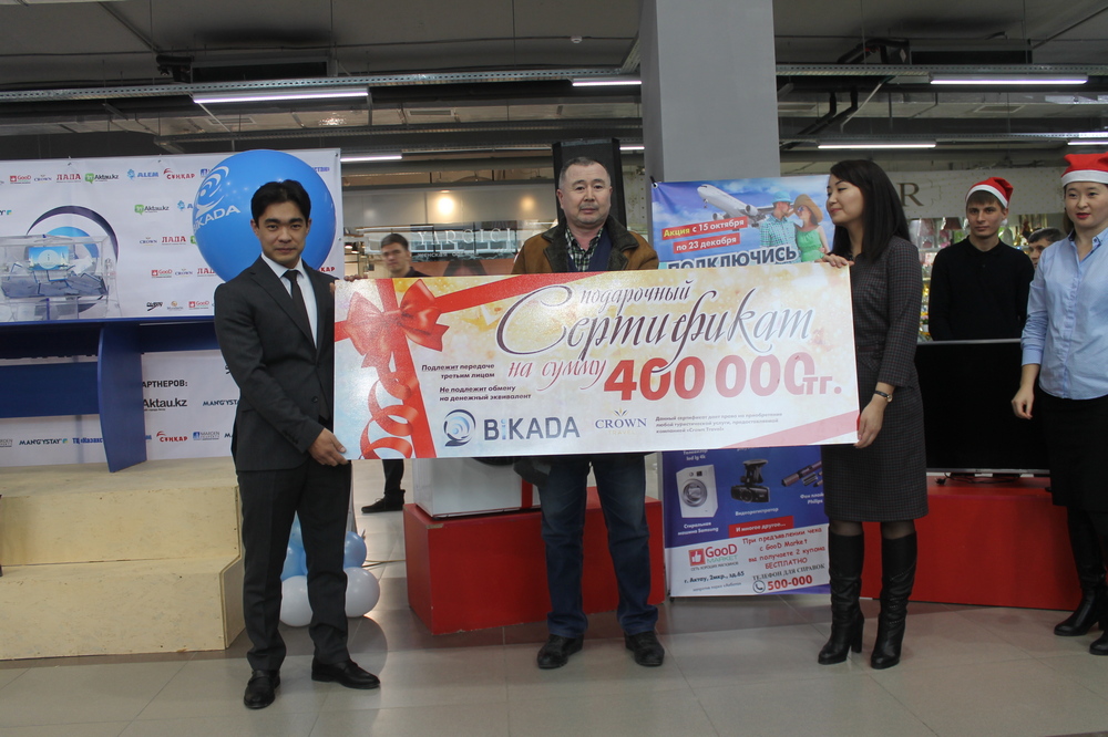 - Я не думал даже, что именно мне достанется главный приз. Я рассчитывал на маленький сувенир, который останется на память, а в итоге достался главный подарок. Конечно, спасибо всем организаторам, руководству компании «БИКАДА». Отдельная благодарность персоналу, который всегда приветливо встретит, подскажет и обслужит. Как специалисты, они всегда готовы помочь. В предстоящий Новый год хочется всем жителям Актау пожелать всех благ, самое главное – здоровья, успехов в работе и счастья в личной жизни, - отметил обладатель главного приза.