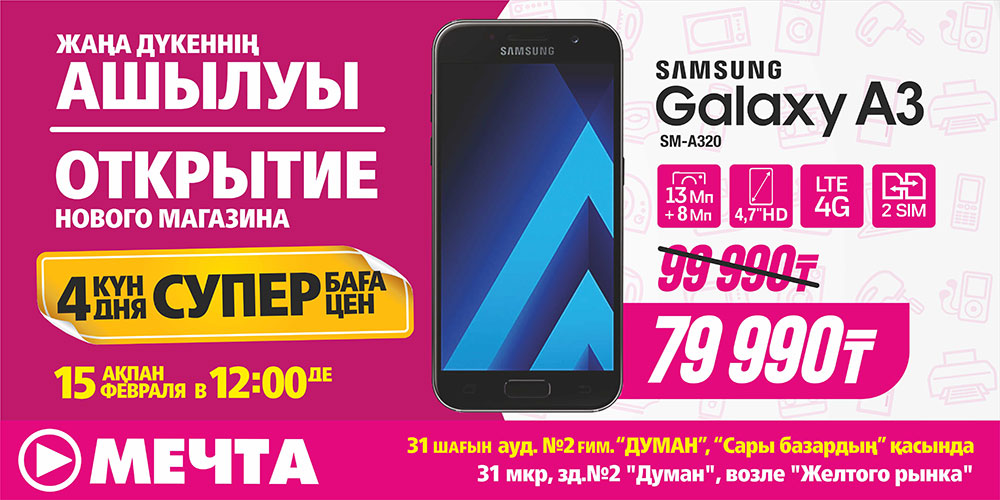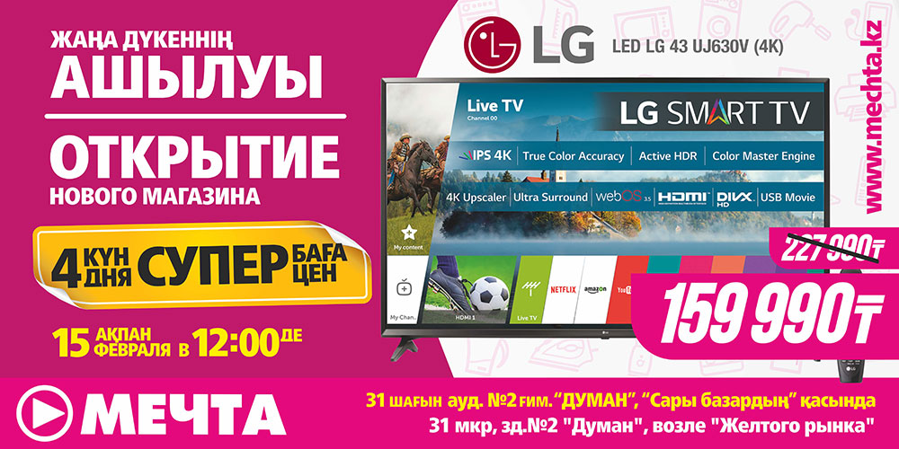 Новый магазин «Мечта» в Актау распахнет свои двери 15 февраля в 12:00 часов в новом ТРЦ «Думан», что находится в 31 мкр. у «Желтого рынка». Именно с этого часа стартуют четыре дня суперскидок – 15, 16, 17 и 18 февраля можно купить технику по очень привлекательной цене.
