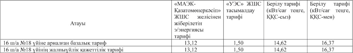 Ақтау қаласы 16 ш/а №18 үй тұрғындарына 2018 жылдың 1-ші шілдесінен бастап соңғы тұтынушыға дейін электр энергиясын тарату тарифі
