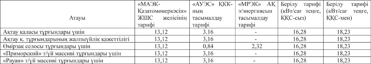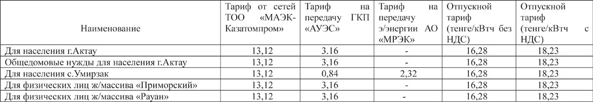 Ақтау қаласы жеке тұлғаларына (Өмірзақ с., «Приморский», «Рауан» тұрғын-үй массивтерін қоса алғанда) 2018 жылдың 1-ші шілдесінен бастап электр энергиясын тарату тарифі