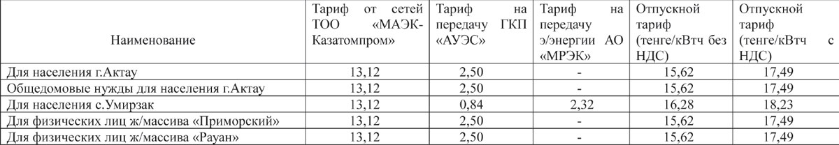 «МАЭК-Қазатомөнеркәсіп» ЖШС әкімшілігіК сведению населения г.Актау!ТОО «МАЭК-Казатомпром» сообщает, что на основании приказа №92 от 14.08.2018 года «Об изменении тарифа на передачу и распределение электрической энергии с 01.07.2018 года ТОО «МАЭК-Казатомпром» снизил тариф на производство электрической энергии для физических лиц на 1,06 тенге, и утвердил следующие тарифы до конечного потребителя:
