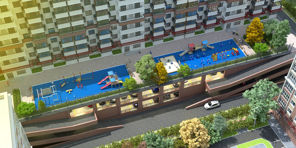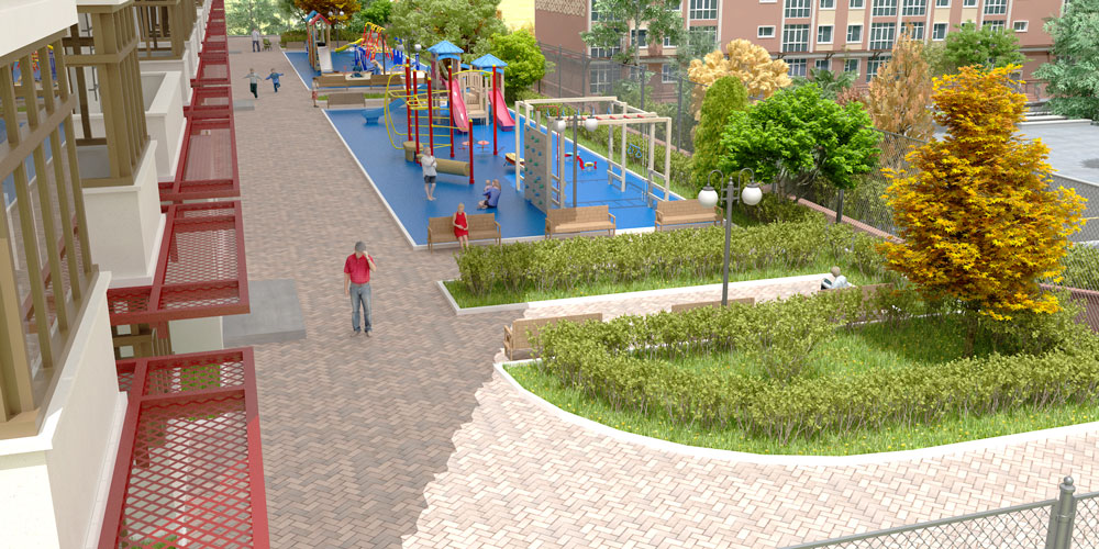 Территория полностью освобождена от автомобилей, и на ней разместятся зоны отдыха, элементы озеленения и ландшафта. Во внутреннем пространстве дома будут организованы цветники, установлены беседки и лавочки. Для ваших детей на территории комплекса будут построены детские и спортивные площадки, травмобезопасная беговая дорожка, футбольное/баскетбольное поля, где они смогут весело играть и развиваться.