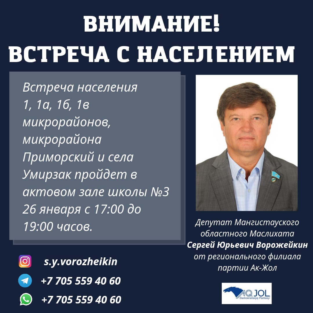 Депутат областного Маслихата Сергей Юрьевич Ворожейкин приглашает население 1, 1а, 1б, 1в микрорайонов, микрорайона Приморский и села Умирзак на общественное собрание в городской школе №3, которое состоится 26 января с 17:00 до 19:00 часов.